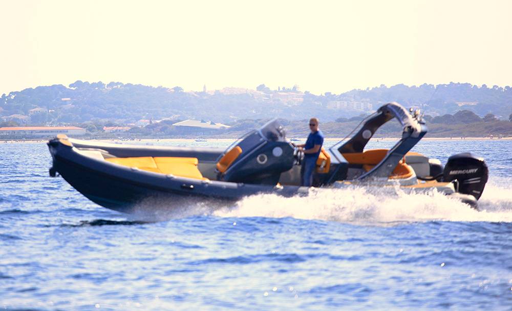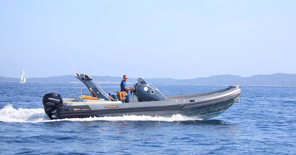 STINGHER 30GT "APO", un des fleurons de sa flotte. Ce semi-rigide de 9,15 mètres, propulsé par un moteur de 350 CV Mercury, est idéal pour les passionnés de navigation qui recherchent une conduite sportive et dynamique. Avec sa capacité d'accueil de 12/14 personnes, il rendra inoubliable vos sorties en famille et ou entre amis.