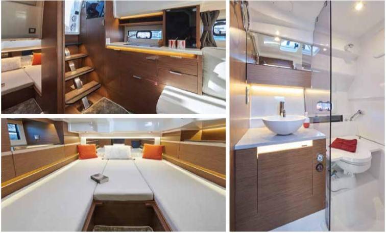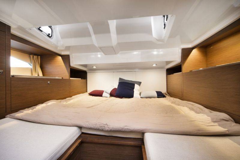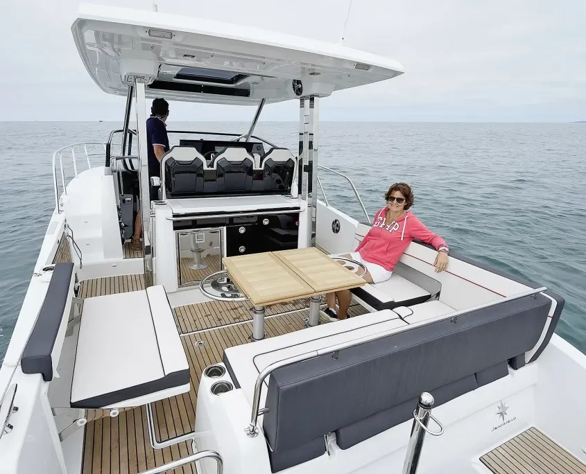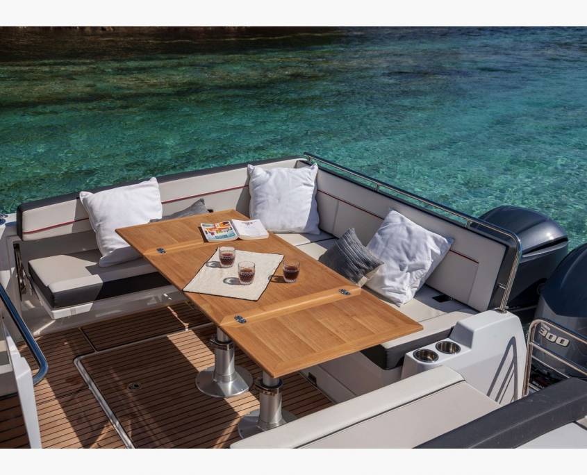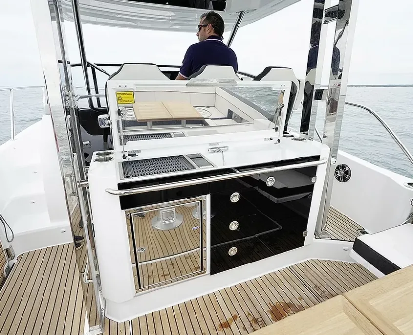 Une fois au mouillage, il y en a pour tous les goûts : bain de soleil et système de chaise longue sur le pont avant pour la détente ; franc-bord escamotable pour créer une plate-forme d’accès à la baignade avec échelle de bain ; plusieurs systèmes de tables amovibles dans le cockpit à choisir en fonction de vos usages.