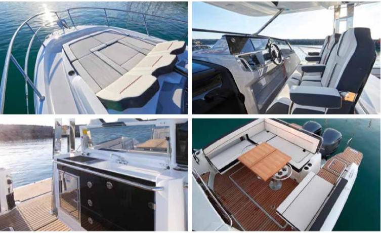 Le leaning post, adossé aux sièges du poste de pilotage donne accès à de nombreux équipements : grill, réchaud à gaz, rangements, réfrigérateur ou même un vivier pour conserver le fruit de votre pêche. L’intérieur, spacieux et confortable, offre une deuxième cabine séparée à l’arrière. Ce Day boat a tout pour vous donner le goût de la croisière et des nuits en mer.