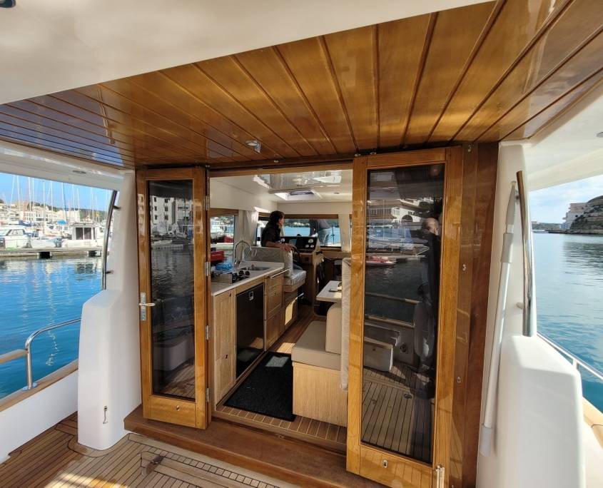 On tombe tout de suite sous le charme, quand on met le pied à bord d’un Sasga. On s’imagine déjà dans une crique à l’eau turquoise de méditerranée avec les odeurs de pins et de garrigue. La qualité des matériaux est palpable, le toucher des boiseries est sensuel et un sentiment de luxe discret émane quand on franchit le seuil de la cabine principale.