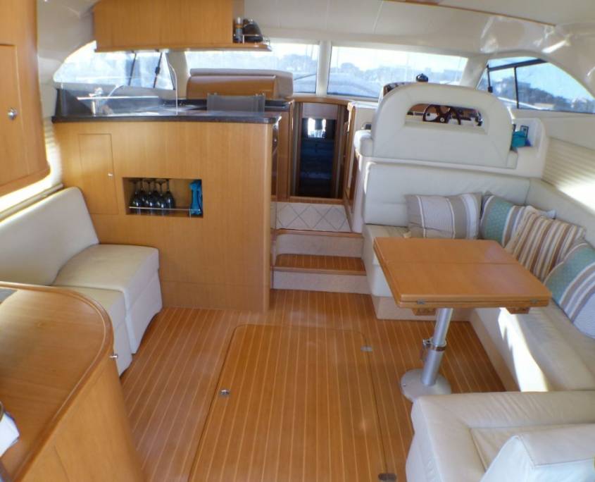 Superbe vedette Rodman 41 Fly équipée de trois cabines dont deux doubles, deux WC électriques, une cuisine avec four multi fonctions, un grand salon ouvert avec TV ouvrant sur un espace spacieux, un fly bridge avec salon et son réfrigérateur et un grand bain de soleil protégé par un très beau bimini.
